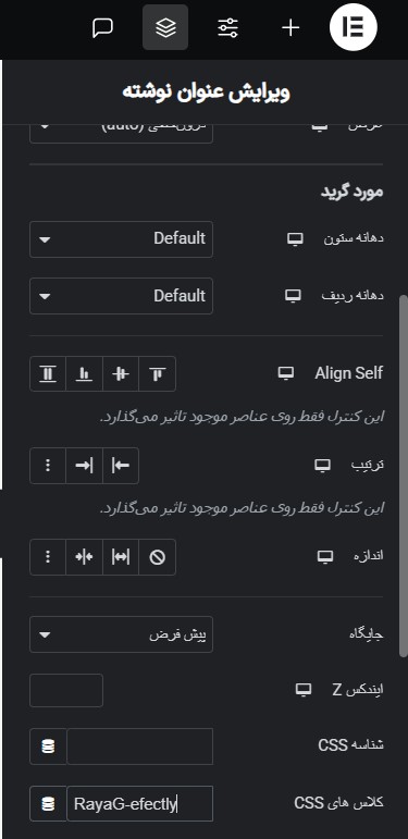 در این مرحله باید یه کلاس به ویجت هدینگ یا عنوان خودمون اختصاص بدیم من برای اینکار کلاس RayaG-efectly رو انتخاب کردم. برای اختصاص کلاس به المان هدینگ باید به تب پیشرفته ویجت بری و در بخش کلاس های CSS اون قسمت کلاسی که بالاتر اشاره شد رو کامل بنویسی 🙂